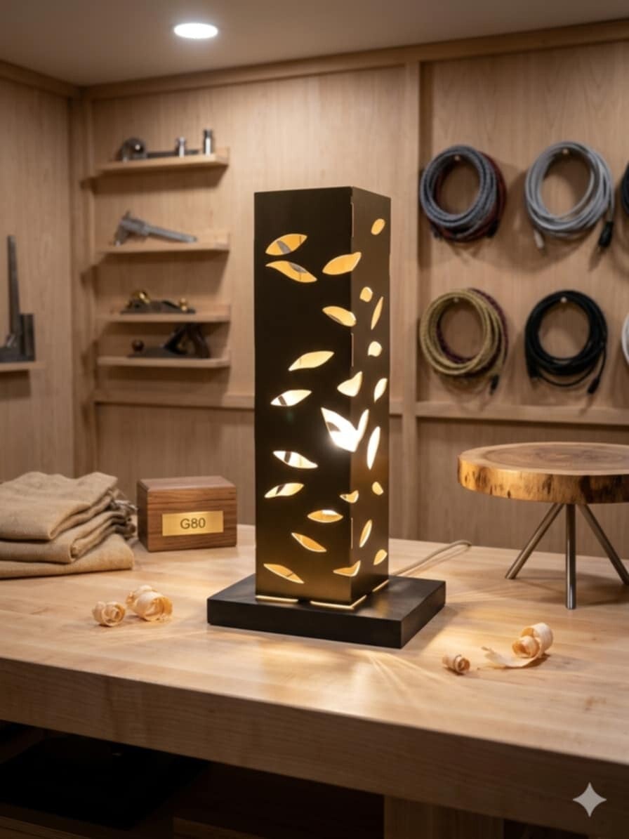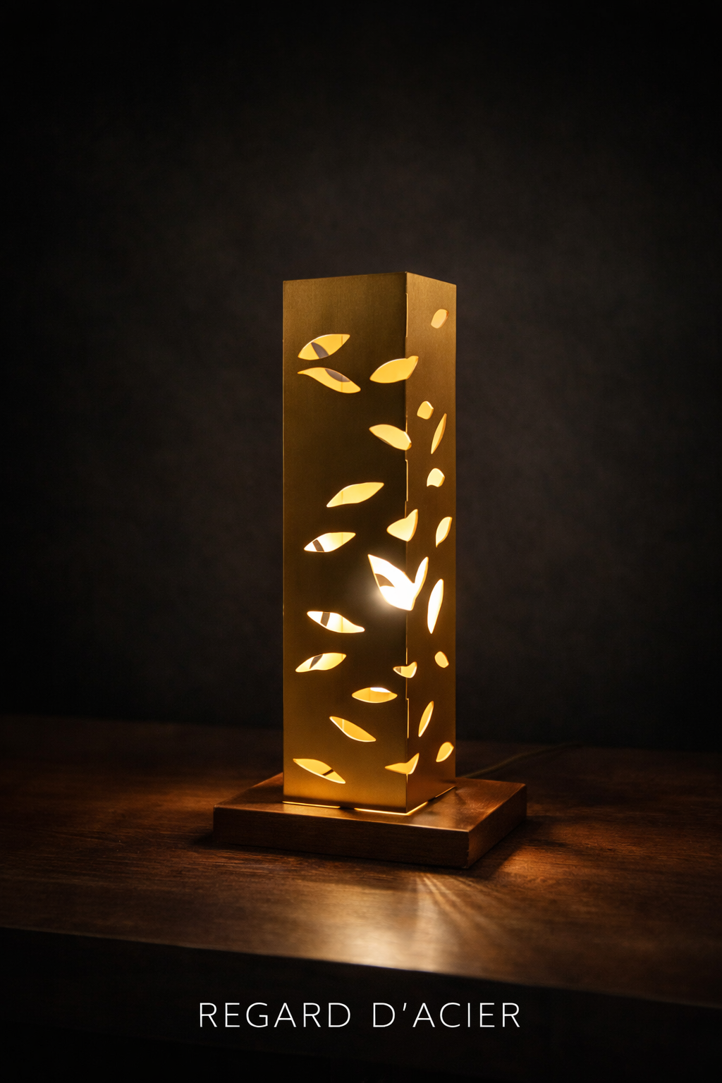 Regard d’acier est une sculpture lumineuse où la surface semble percée par des ouvertures organiques, laissant passer une lumière chaude et enveloppante.