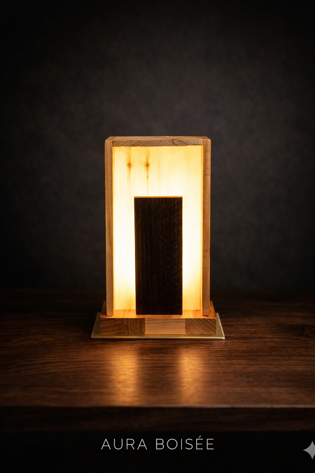 Aura boisée est une sculpture lumineuse minimaliste, où la matière encadre la lumière dans une forme simple et équilibrée.