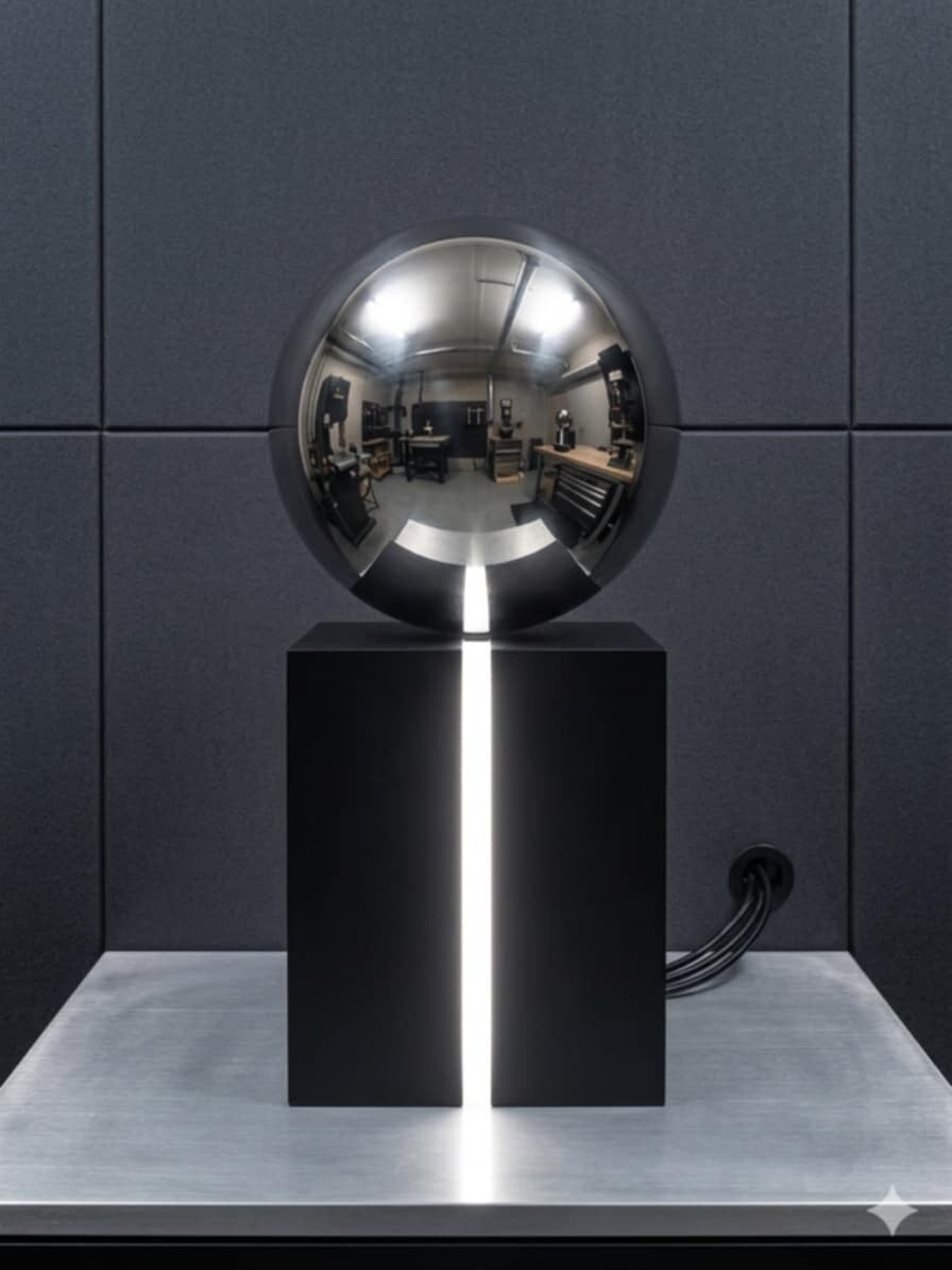 La sphère en acier reflète son environnement, tandis que la ligne lumineuse vient structurer la base avec précision.