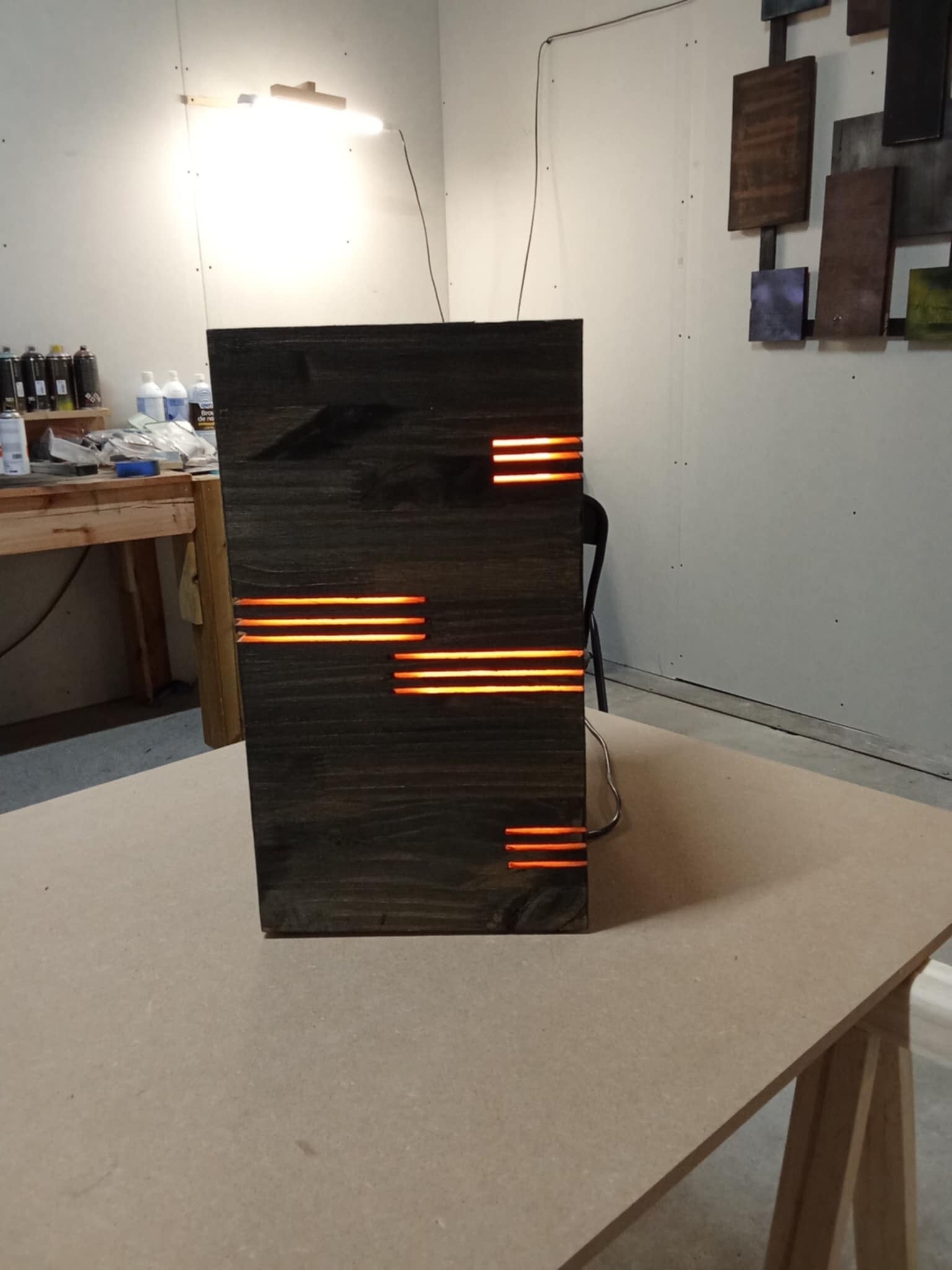 Cette pièce joue sur la rupture visuelle, où la lumière surgit par fragments dans une structure fermée.