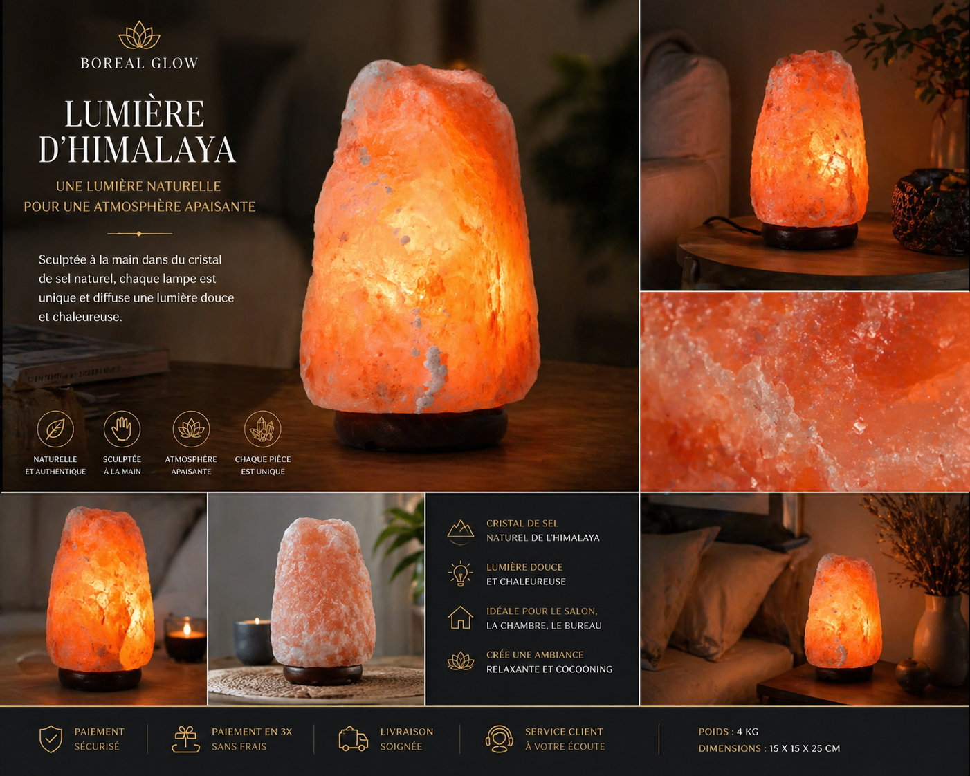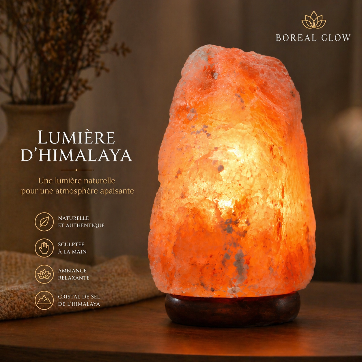 Chaque pièce révèle les nuances et textures naturelles du sel d’Himalaya, faisant de chaque lampe une création singulière.